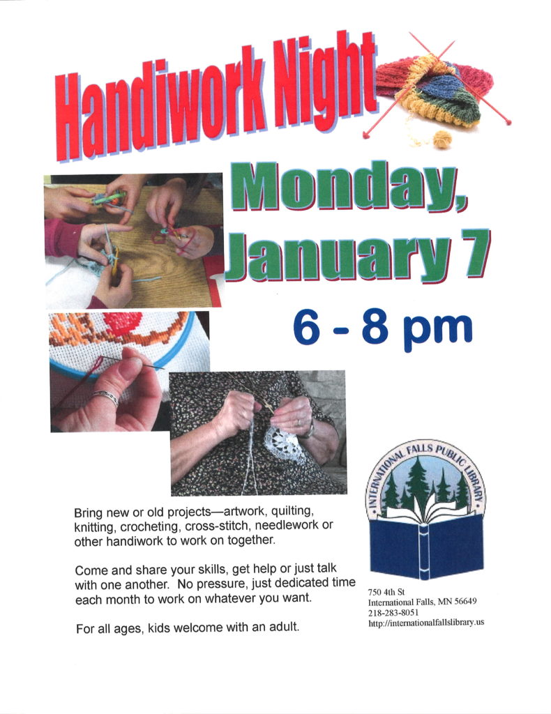 And when you can’t stand it any more, we have a potential solution: Handiwork Nights. On the first (and usually the third) night of the month, bring whatever you happen to be working on and join us. We paint, draw, knit, crochet, and quilt.