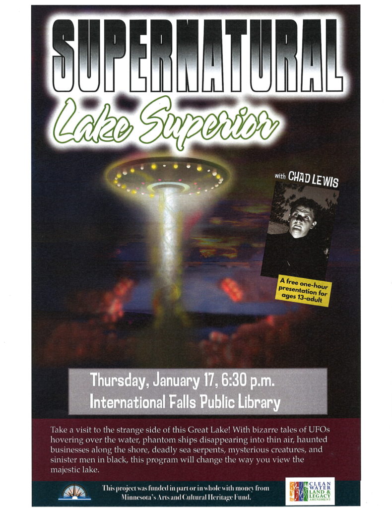 Come join us for an evening of stories about the supernatural side of Lake Superior. Chad Lewis will share tales of UFOs, phantom ships disappearing into thin air, mysterious creatures, and other strange phenomena.